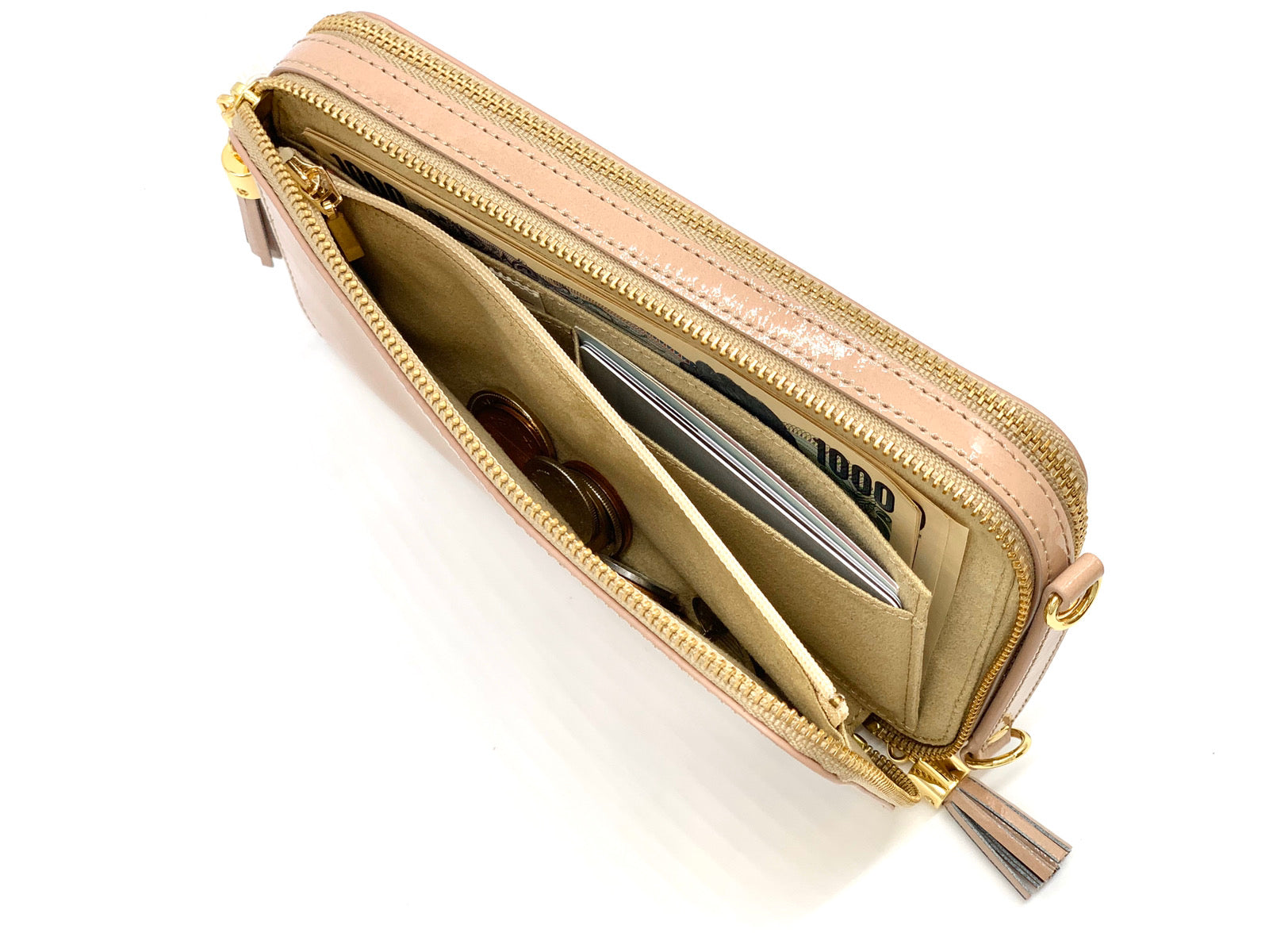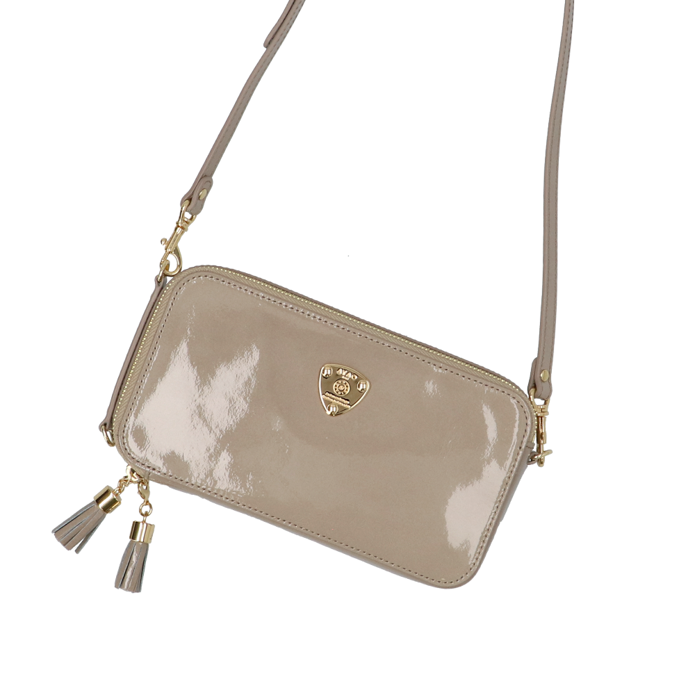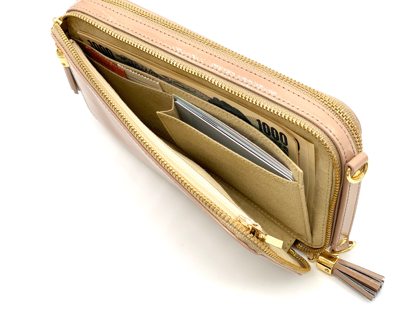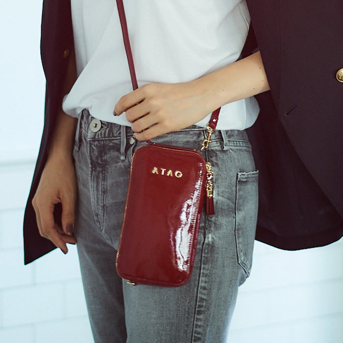 ATAO(アタオ)(あたお)の大切な貴重品を守るという意味を込め名付けられたお財布ポシェット(スマホポシェット『アミュレット』。(ウォレットポシェット)(モバイルバッグ)(スマホポシェット)思いやりや優しさを育むと言われる『ローズクォーツ』、勝利を呼び幸福をもたらす『ルビー』、愛と献身を意味する『エメラルドグリーン』、長寿や健康を意味する『パールグレージュ』の全4色。(エナメルレザー)(カウレザー)(牛革素材)(肩がけ)(斜め掛け)(ショルダーバッグ)(ミニバッグ)(マイクロバッグ)(クラッチバッグ)(あみゅれっと)(お財布スマホポシェット)(モバイルポシェット)(スマホショルダー)