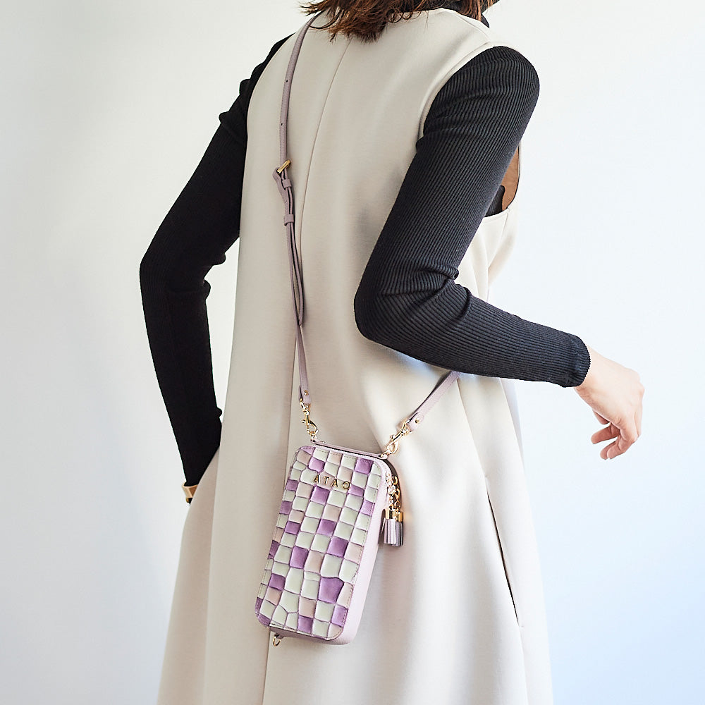 ATAO(アタオ)(あたお)清爽なホワイトカラーに淡いピンクのバラとラベンダーが甘く優しく映える「ロージーラベンダー」がアミュレット?ヴィトロ(あみゅれっと)(お財布ポシェット)(お財布スマホポシェット)(モバイルポシェット)(ウォレットポシェット)(クラッチバッグ)(モバイルバッグ)(スマホショルダー)(スマホポシェット)(肩掛け)(斜め掛け)(ショルダーバッグ)(マイクロバッグ)(お財布スマホポシェット)に仲間入り。透明感と潤いを感じるステンドグラスのようなイタリアレザーは手に取る度に花の息吹に触れているような爽やかな気持ちにさせてくれます。ふんわりとほのかに香る甘いフレグランスのようなATAO至上最も甘いオリジナルカラーです。