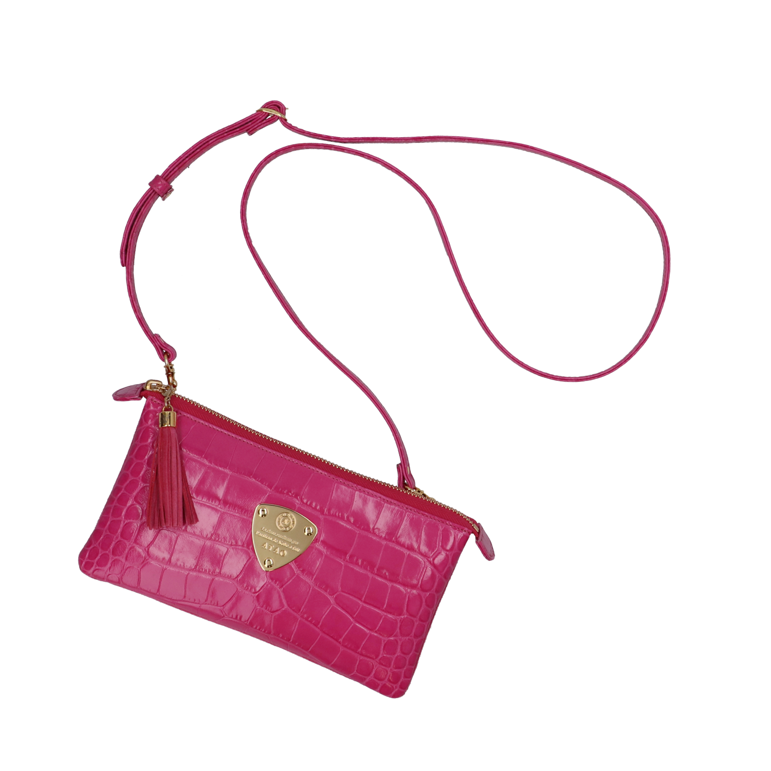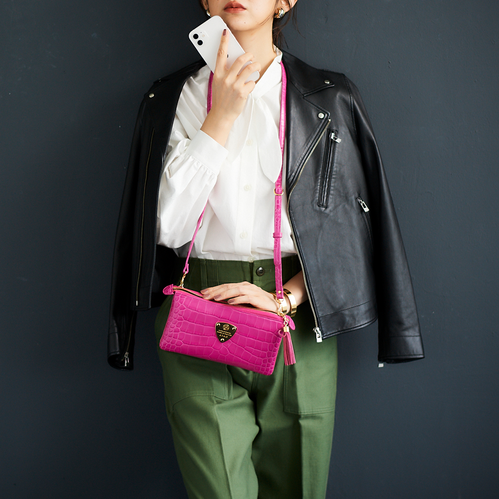 イタリア生まれのエンボスレザー(型押し)を贅沢に使用した鮮やかな発色が特徴のATAO(アタオ)のお財布ポシェット(ウォレットポシェット)(クラッチバッグ)(ショルダーバッグ)(肩がけ)(斜め掛け)『ブーブー?クラッシー』。(ブーブークラッシー)(ぶーぶーくらっしー)国内ではなかなか目にしない独創的で大胆なカラーリングが魅力。(イタリアンレザー)(牛革素材)(カウレザー)(イタリアレザー)