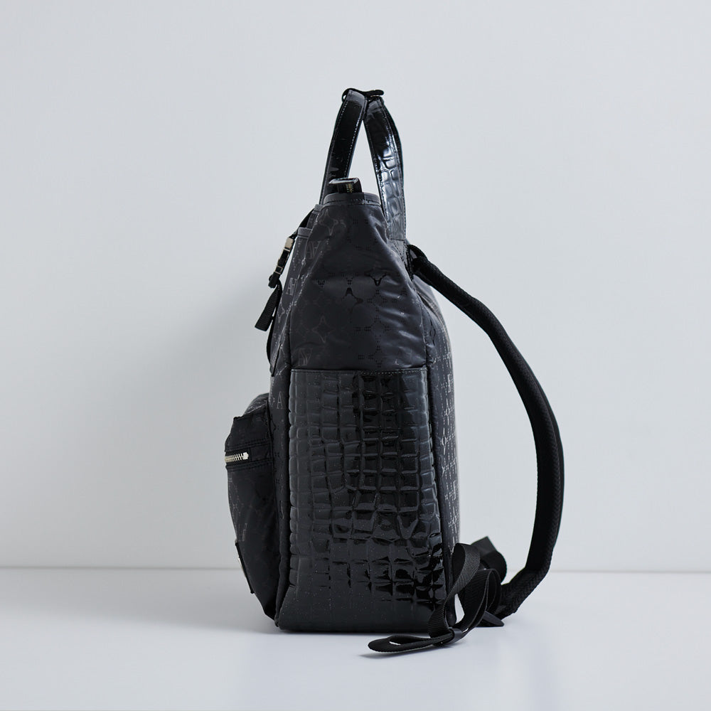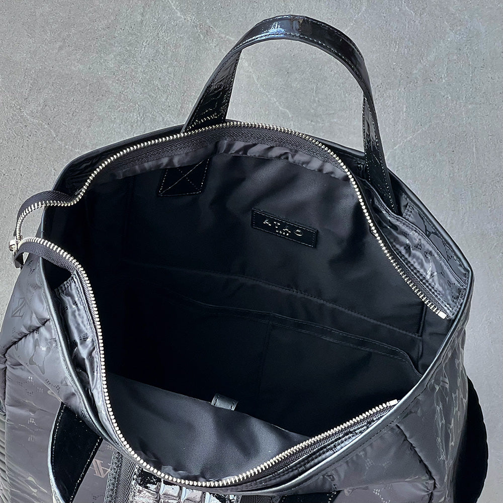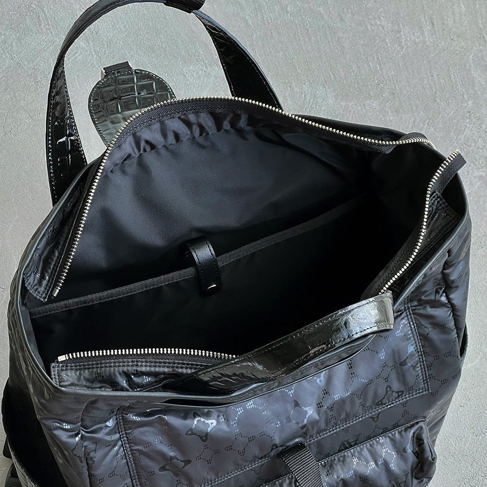 モノグラムでありながらも控えめなビジネスシーンにも取り入れやすい「both」。ATAOのテキスタイルにフォーカスしたbothは、ブラックの撥水リサイクルナイロン(ポリエステル)にシックに艶めくモノグラム柄と、イタリアンエナメルレザーの切り替えしがクールな逸品。エナメルレザーにはグリッター加工(パール加工)を施し、気になる指紋が目立ちにくい仕様。クッション性のある裏地をいれたボンディング加工で、パソコンを直接収納できるポケット付き。リュックを背負っている事を忘れてしまうほど非常に軽量で、ビジネスシーンにも最適。取引先への挨拶には、リュックのショルダーベルトをサイドのポケットしサッと収納し、トート型としてスッキリお持ちいただく事も。15インチのパソコンも難なく収納可能なデザイン?機能性ともに満足度の高い万能リュックです。ATAO(アタオ)(あたお)(リュック)(バックパック)(メンズ)(ユニセックス)(男女兼用)(男性も使える)(ナイロン)(イタリアレザー)(ビジネスバッグ)(ビジネスリュック)(通勤バッグ)(仕事バッグ)(オフィスコーデ)(トートバッグ)(A4サイズ)(パソコン)(both)(ボウス)(ぼうす)(両方)