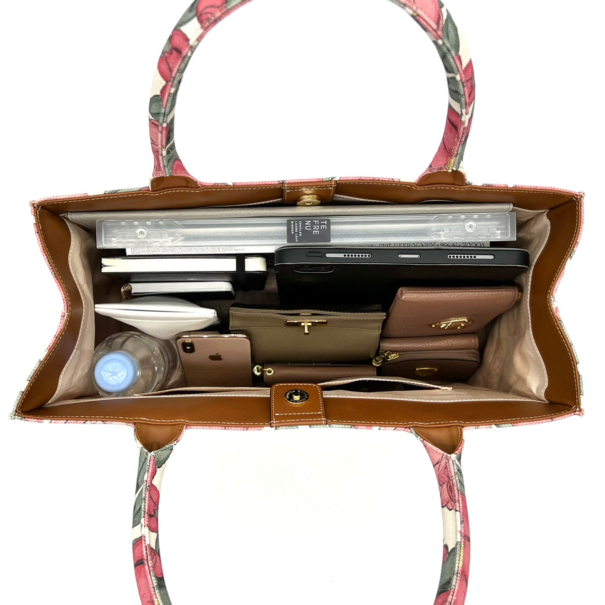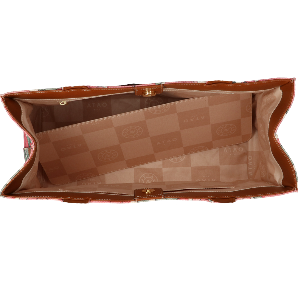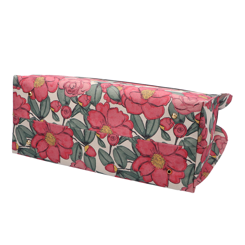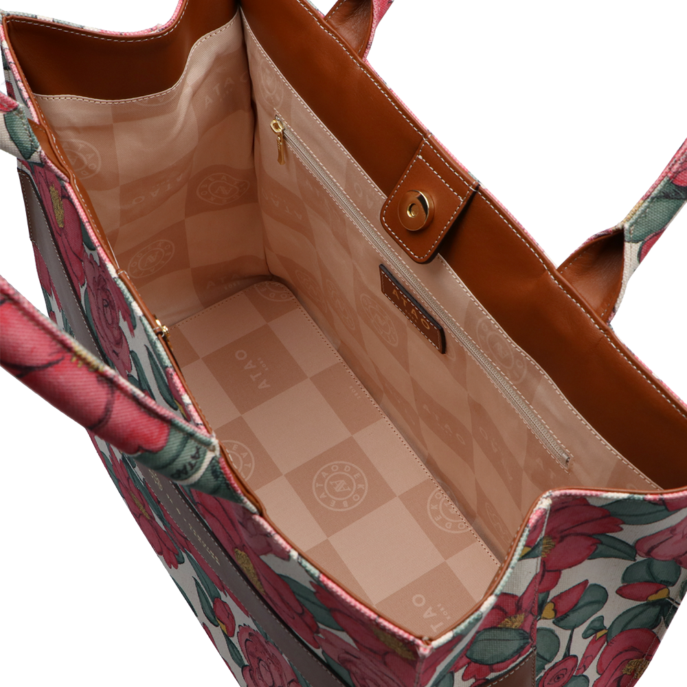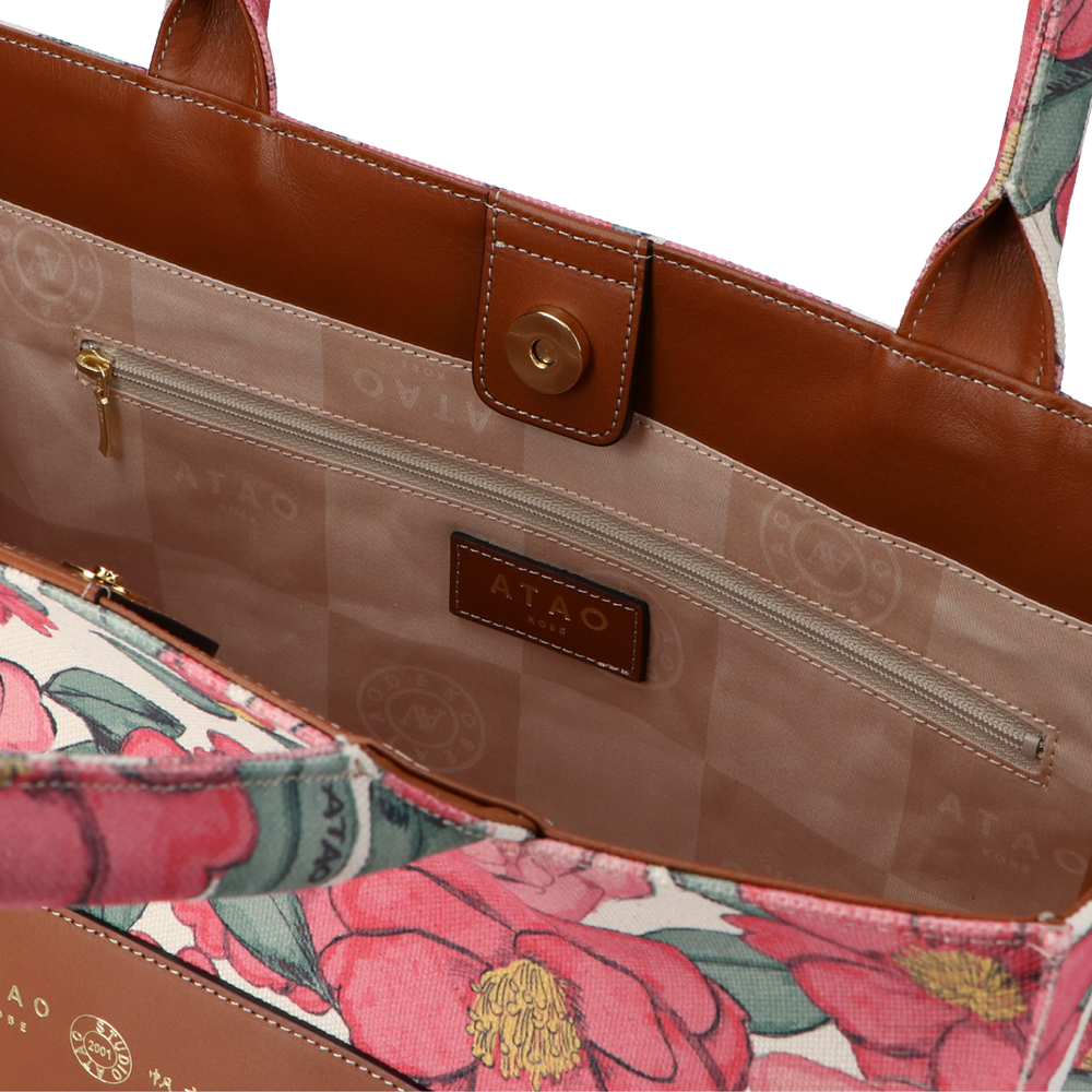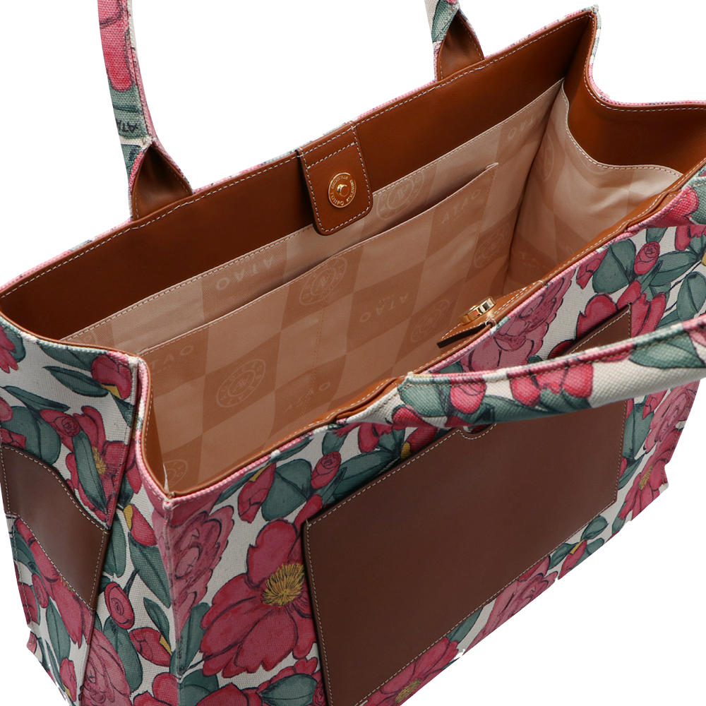 ATAO(アタオ)が咲かせる大輪の「サザンカ」が新たな物語を刻む。「Camellia sasanqua(カメリアサザンカ)」。サザンカは神戸を象徴するシンボルツリー。神戸ブランドATAOにふさわしい花と言えます。ATAOのデザイナーが描いた鮮やかなサザンカのアートを、職人による繊細な色付けでバッグというスクリーンに表現した「Cinema(シネマ)」。この新たなテキスタイルからATAOの新しい物語が始まろうとしています。(A4バッグ)