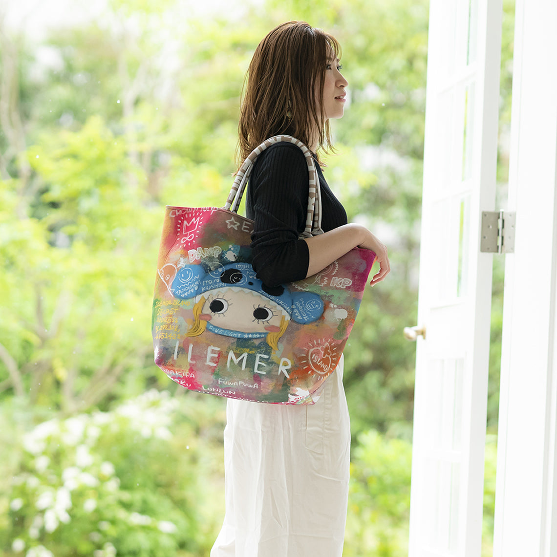 非常に軽くて柔らかい人気のエアリートート「LUNLUN」。(ルンルン)(るんるん)(トートバッグ)(肩がけ)(ワンショルダー)ウエットスーツに使用されるネオプレーン素材に手書きのILEMER(イルメール)(いるめーる)オリジナルのイラストがプリントされたトートバッグ。(イーマリー)(カラフル)
