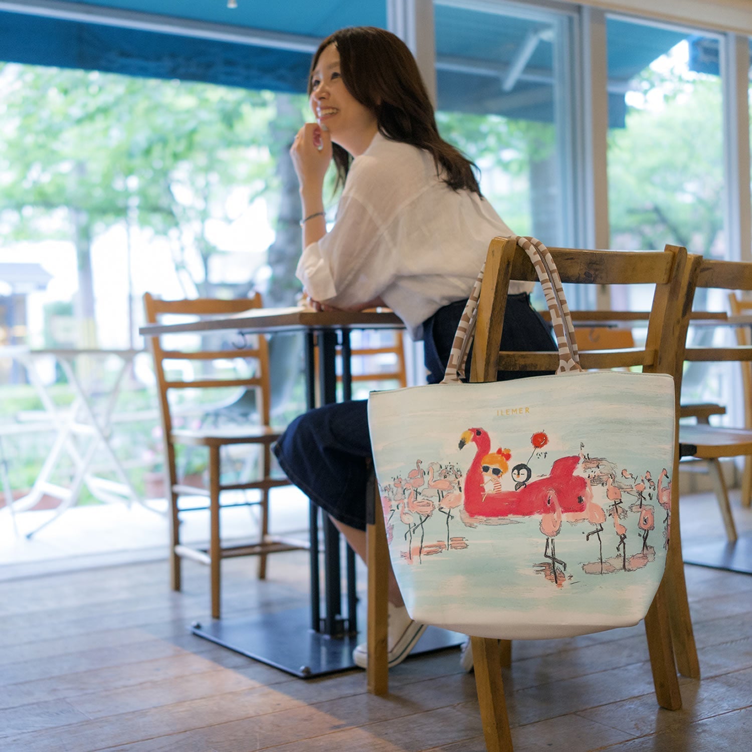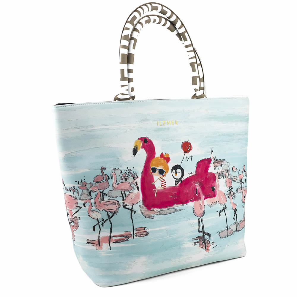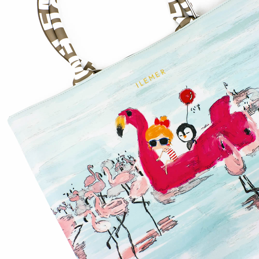 非常に軽くて柔らかい人気のエアリートート「LUNLUN」。(ルンルン)(るんるん)(トートバッグ)(肩がけ)(ワンショルダー)ウエットスーツに使用されるネオプレーン素材に手書きのILEMER(イルメール)オリジナルのイラストがプリントされたトートバッグ。(イーマリー)(フラミンゴ)(皇帝ペンギンKP)(ケーピー)(水色)(ブルー)