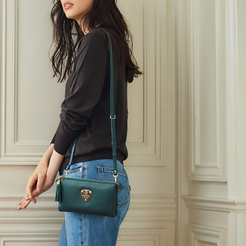 大人気のお財布ポシェット(ウォレットポシェット)(クラッチバッグ)【オフィスブーブー】に、植物のように青々と瑞々しいatelierAtao(アトリエアタオ)限定『ボタニカルグリーン』登場。生き生きとした美しい発色は、光の加減でグリーンにもネイビーにも見える絶妙なカラーです。