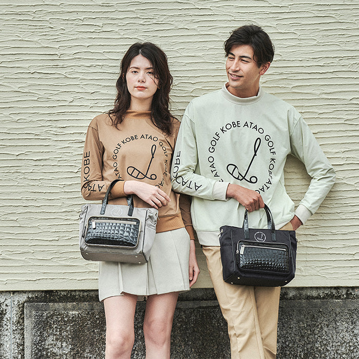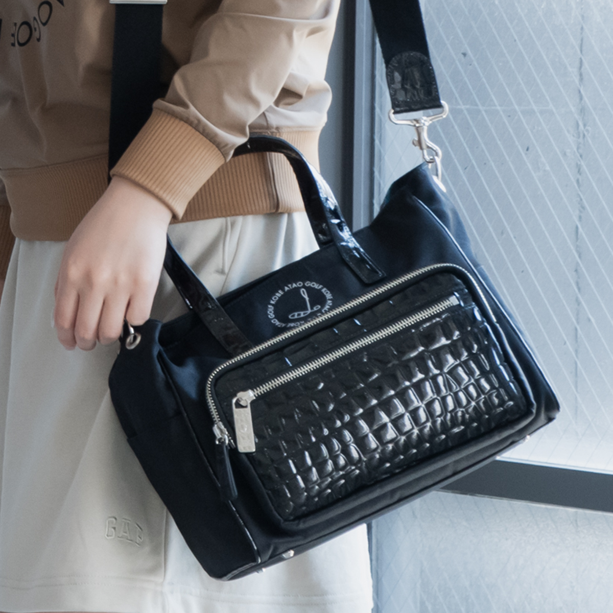 ゴルフブランドとして誕生したATAO GOLF。今季のシーズンでは、新ライン「スマルトシリーズ」。イタリアンレザーとナイロン素材を組み合わせ、晴れの日も雨の日も思うがままに。シンプルなアイテムトーンは、ゴルフプレーはもちろん日常でも愉しめます。どこでどのようにアイテムを取り入れるか、あなた次第。ここが原点であり、あたらしい日常への入り口です。上質で光沢感のあるイタリアのエナメルレザーとナイロンを組み合わせ、職人による手仕事で生産したこだわりのバッグとなります。エナメルはイタリア語で「スマルト」と呼ぶことから、シリーズ名が誕生。急な天候の変化にも対応できる撥水加工の機能性に加え、持ち運びしやすい設計デザインとスマートなシルエットは、移動中などの気分を上げてくれること間違いなしです。ラウンド中の移動やタウンユースでも使いやすいサイズ感のトートバッグ。(ATAOGOLF)(アタオゴルフ)(あたおごるふ)(男女兼用)(ユニセックス)(メンズ)(男性も使える)(デイリーユース)(普段使い)(バッグ)(ハンドバッグ)(ミディアムバッグ)(撥水素材)(撥水性)(エナメル)(雨の日も使える)(撥水バッグ)(スマルトラウンドトート)(smalt round tote)